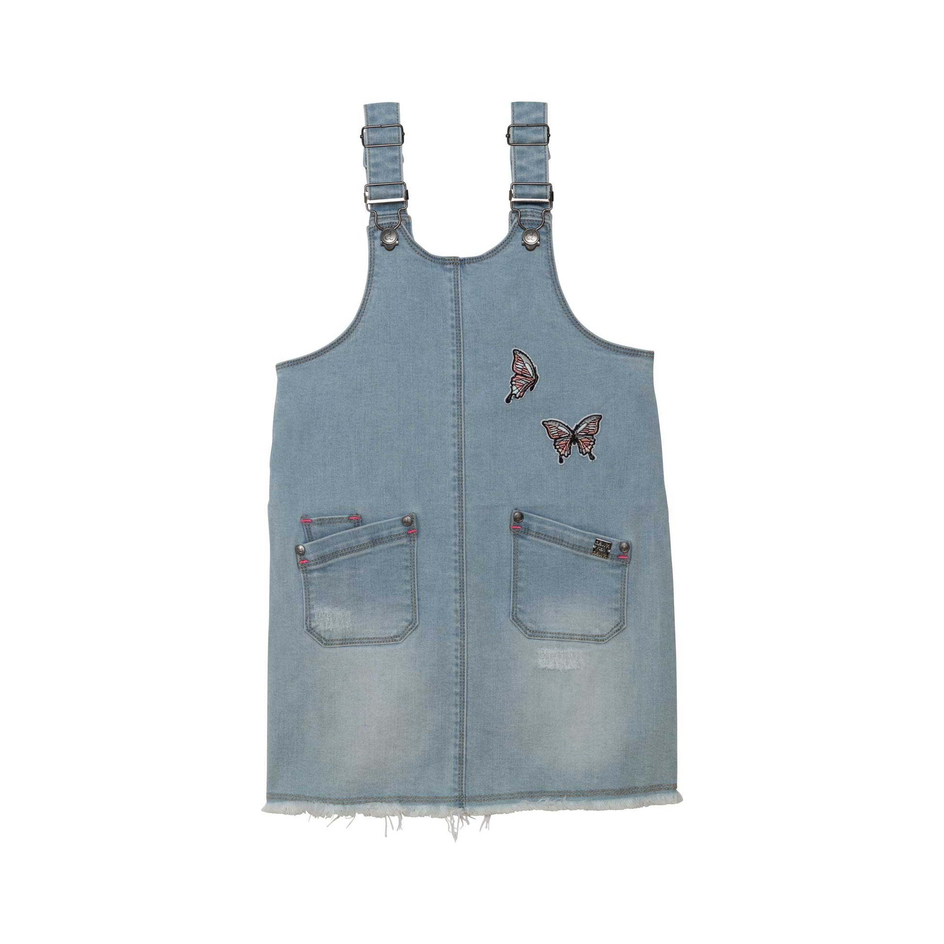 Adjustable straps and a scoop neckline make this denim dress easy to layer over any top or tee. Our Denim Overall Dress Light Blue Denim is made from extensible cotton/poly denim and features a comfortable fit with front pockets, pop color bartacking, and embroidered butterflies. It's finished with frayed edging around the hem.