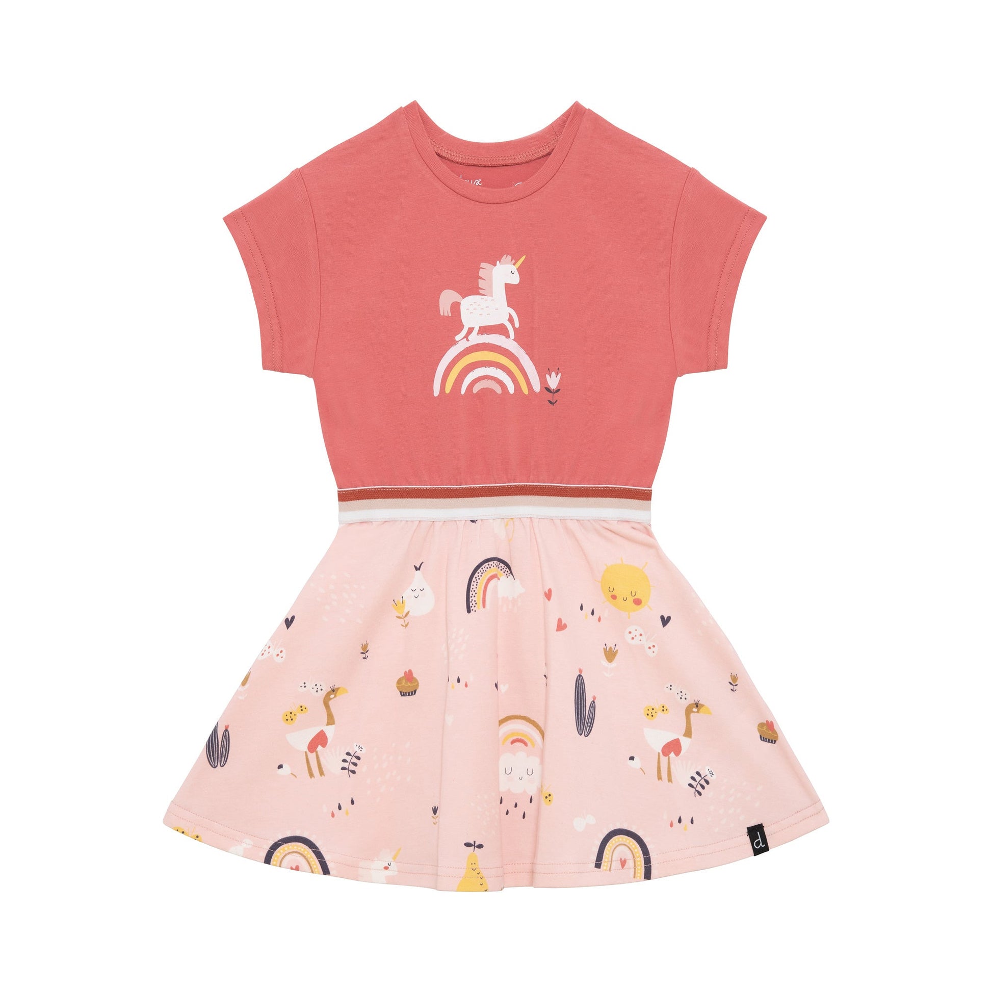 With rainbows and unicorns, our Organic Cotton Printed Dress Faded Rose is perfect for any girly-girl. This adorable design features a short sleeve bodice with a round neckline, a graphic print on the chest, and a striped rib knit band at the waist. The flared A-line skirt is full of charm with a unicorn, cupcake, and rainbow print.