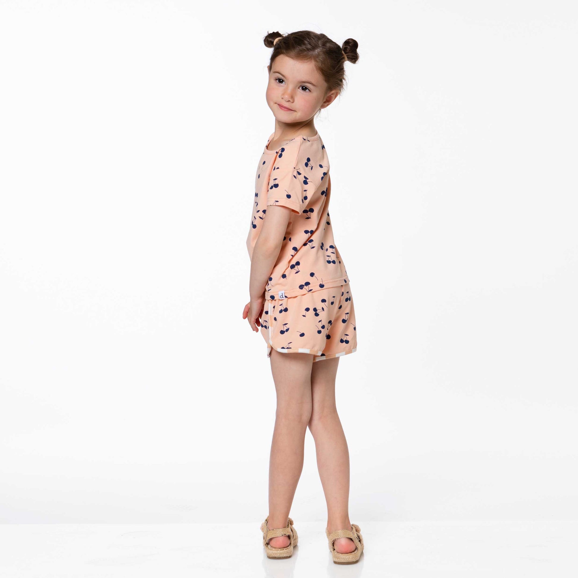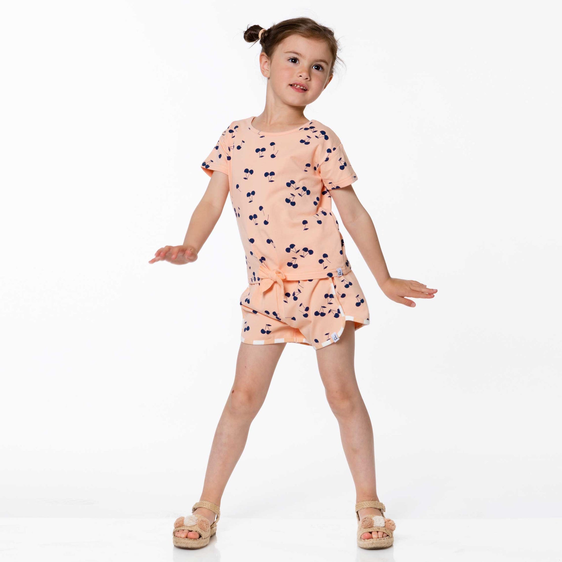 Featuring a cherry print with contrasting stripes, our Organic Cotton Printed Slub Short offers sporty style with a girly twist. This short features a comfortable pull-on fit with a extensible elastic waistband, shirred details, and a curved dolphin hem.