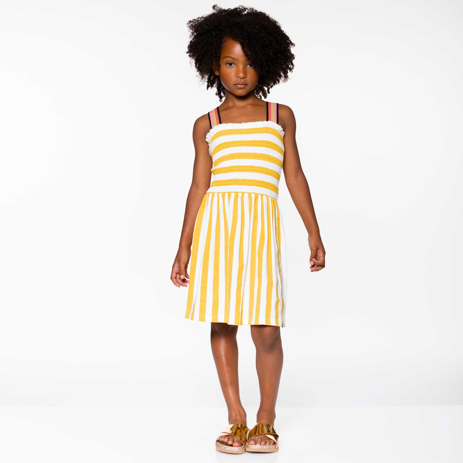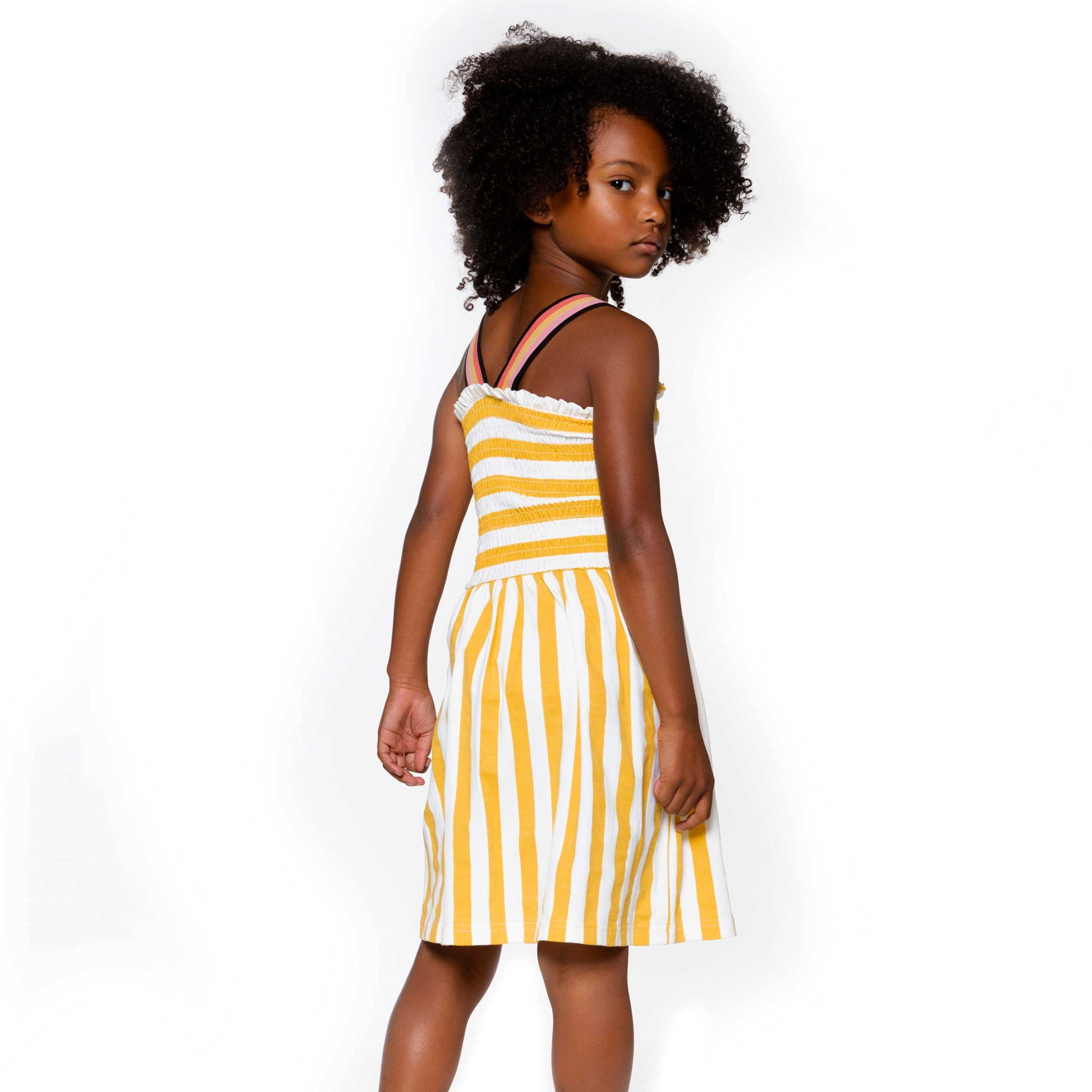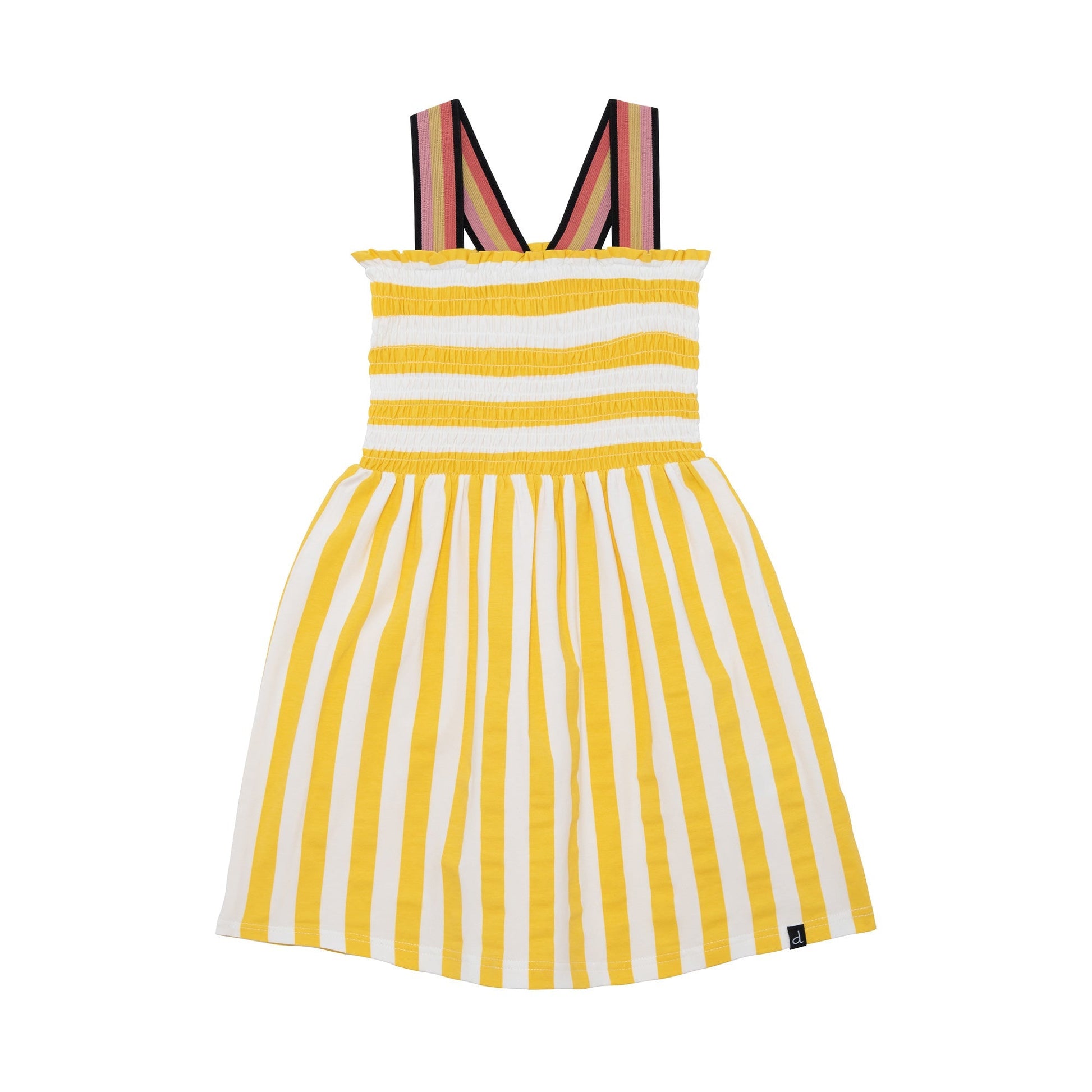 Vertical and horizontal stripes combine to make our Organic Cotton Striped Dress Yellow one of our most playful looks of the season. This darling dress features an organic cotton bodice with allover smocking, a square neckline, striped rib knit straps, and a flared skirt.